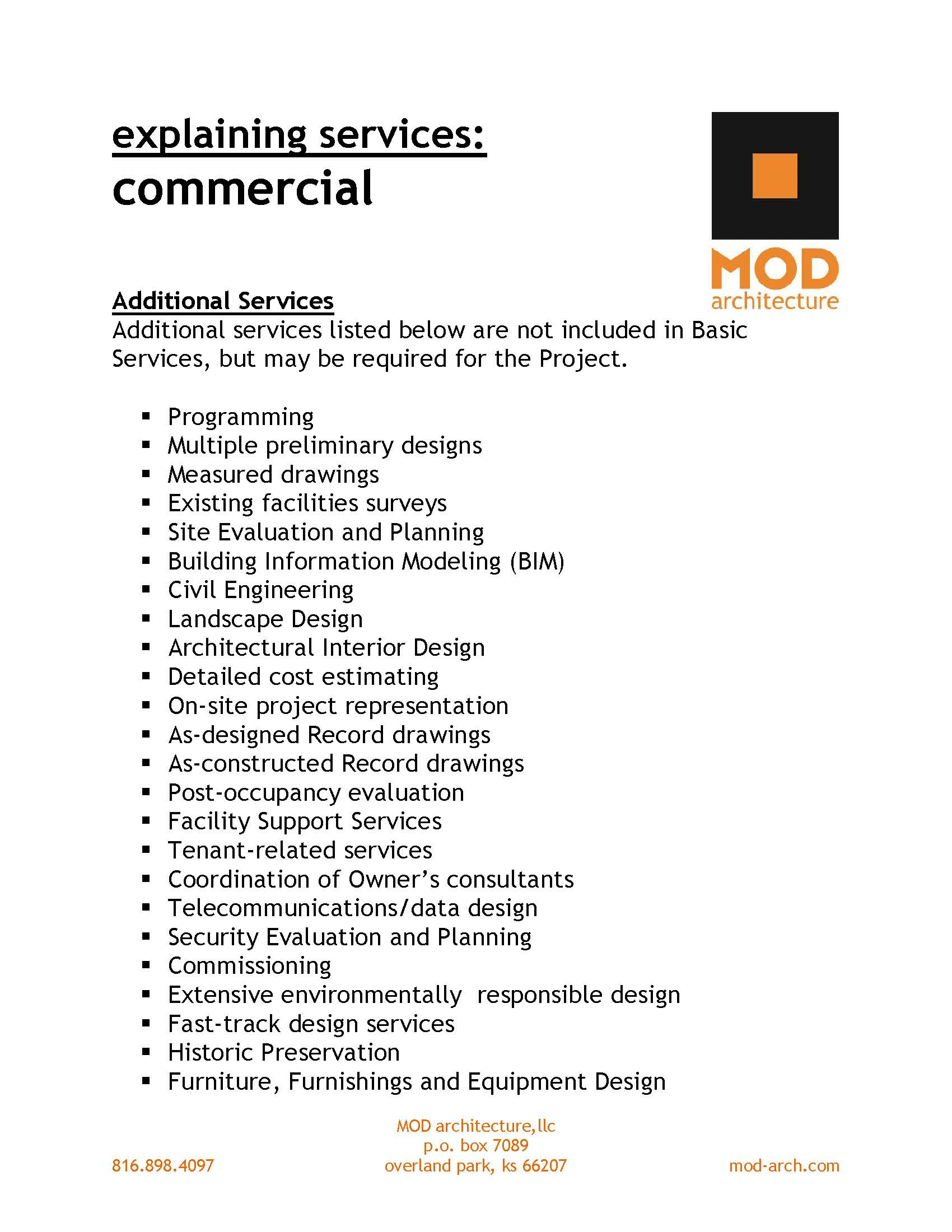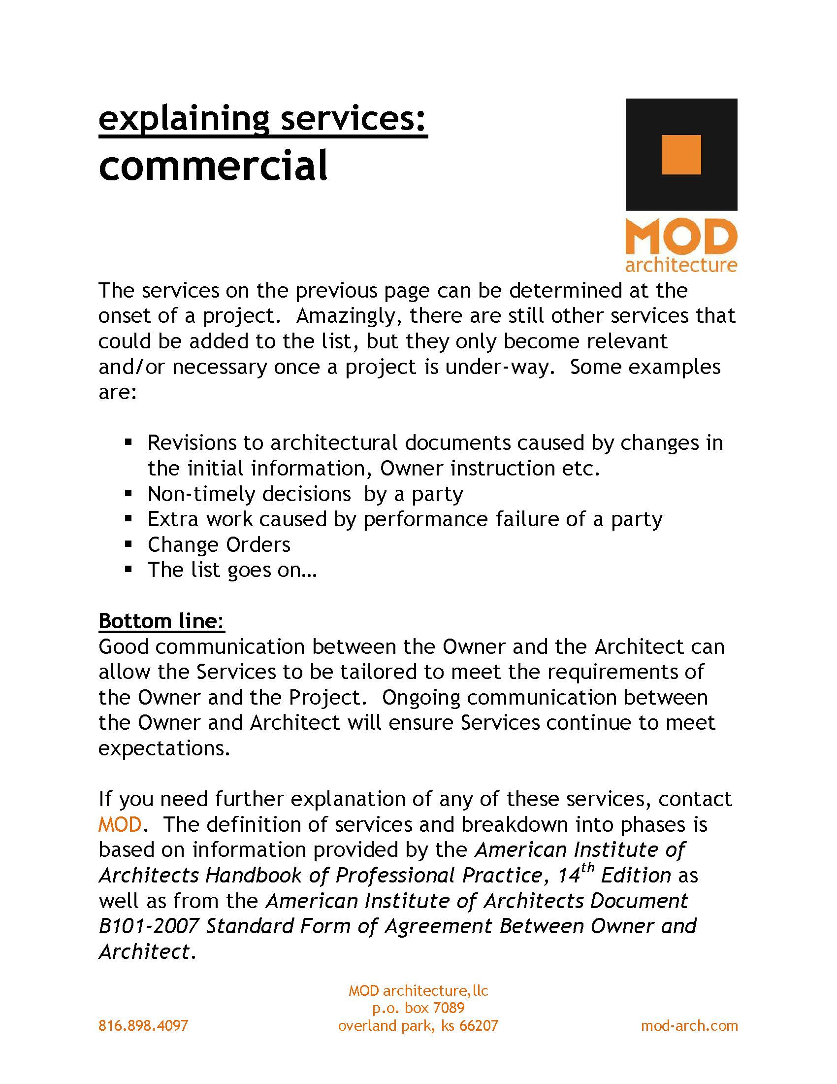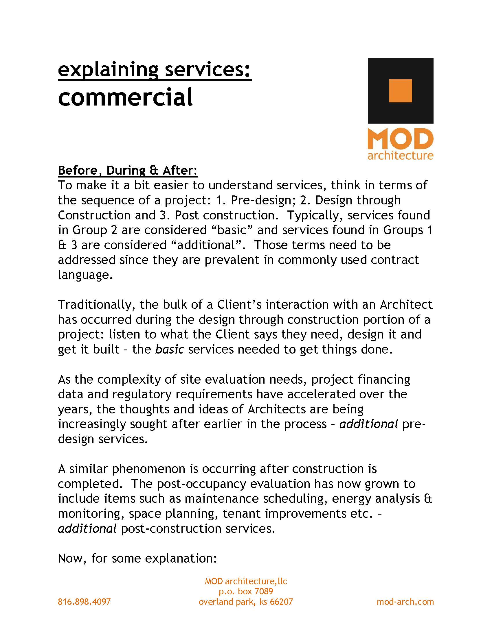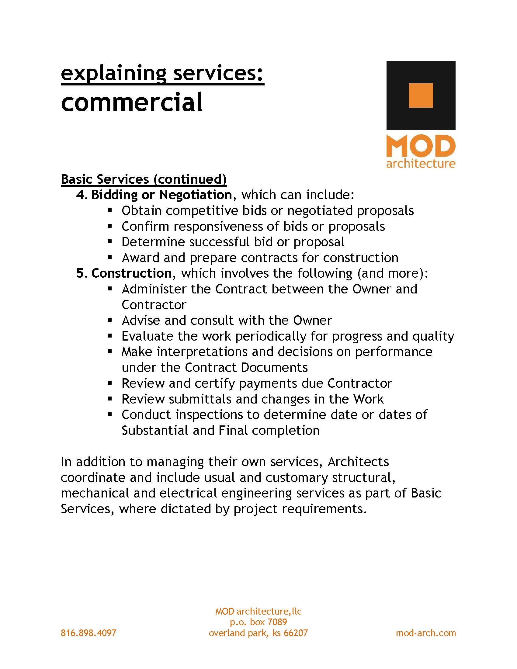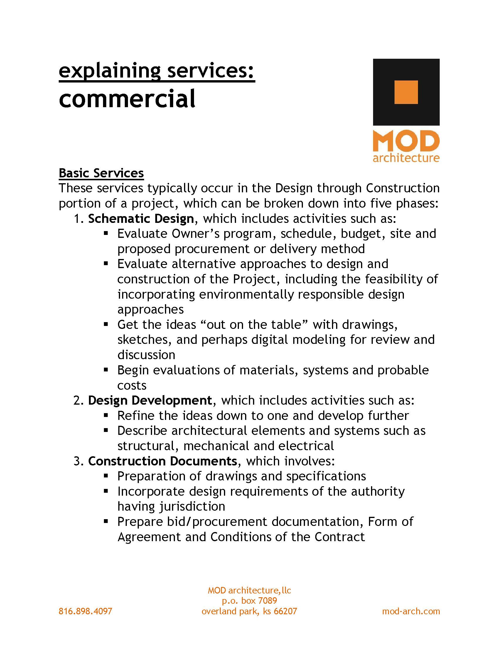 Commercial projects can encompass a wide variety of project types with a diverse set of circumstances influencing how each one comes together. Hence, the type and level of service varies widely from project to project.