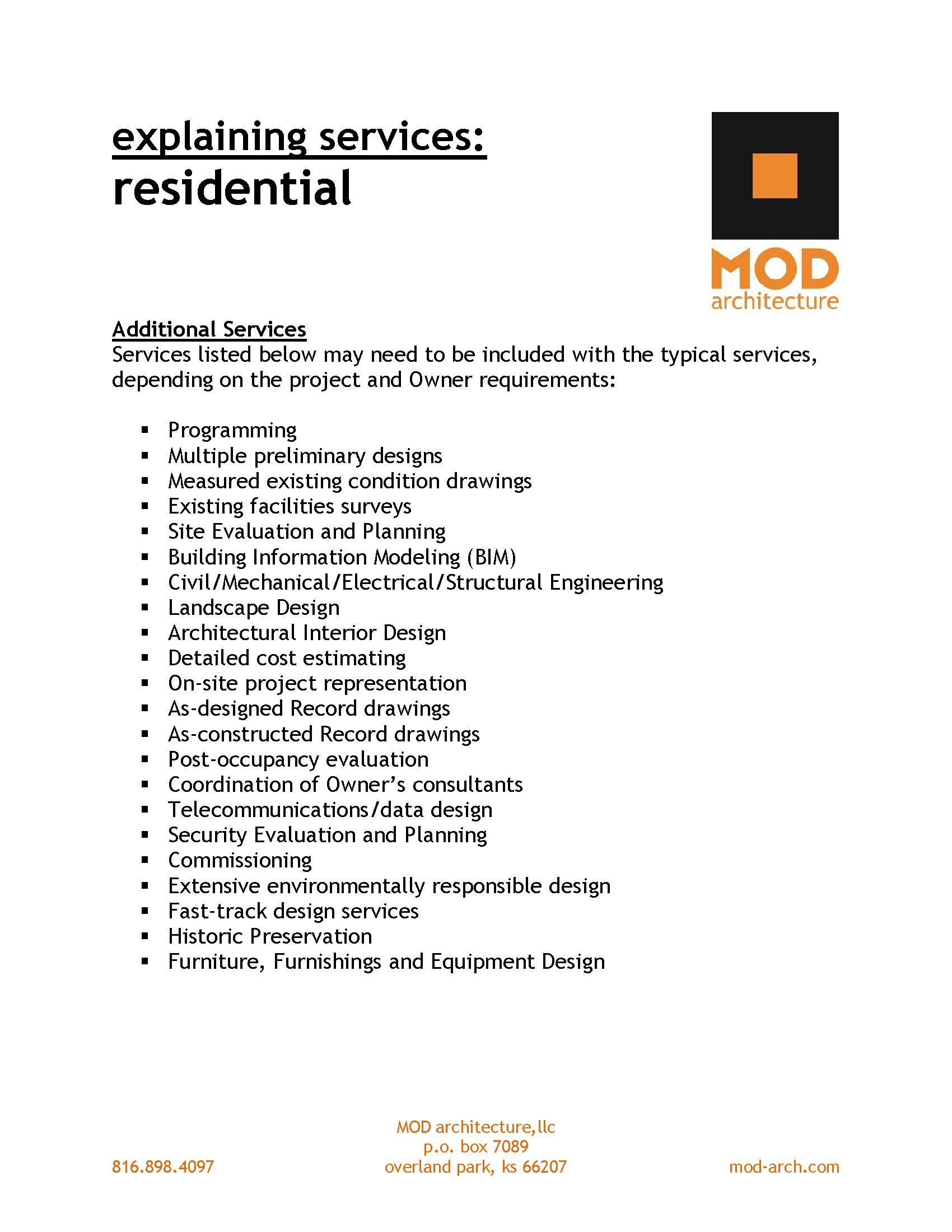 The architectural services needed for a residential project are not typically as extensive as what are needed for a commercial project. However, some residential work can be every bit as complicated as a commercial project - good thing MOD has plenty of experience with both.