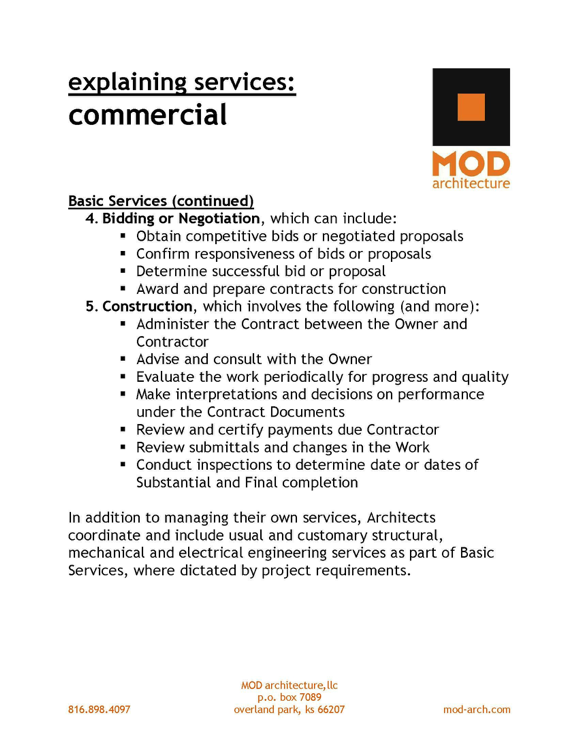 Commercial projects can encompass a wide variety of project types with a diverse set of circumstances influencing how each one comes together. Hence, the type and level of service varies widely from project to project.