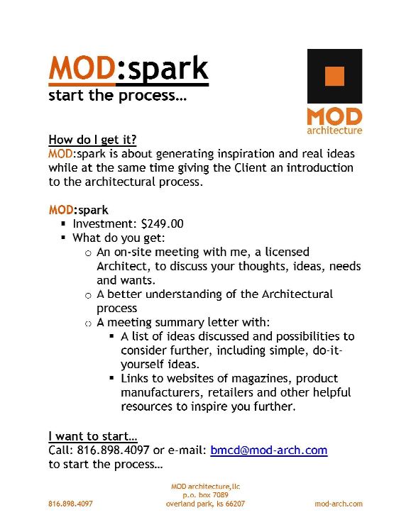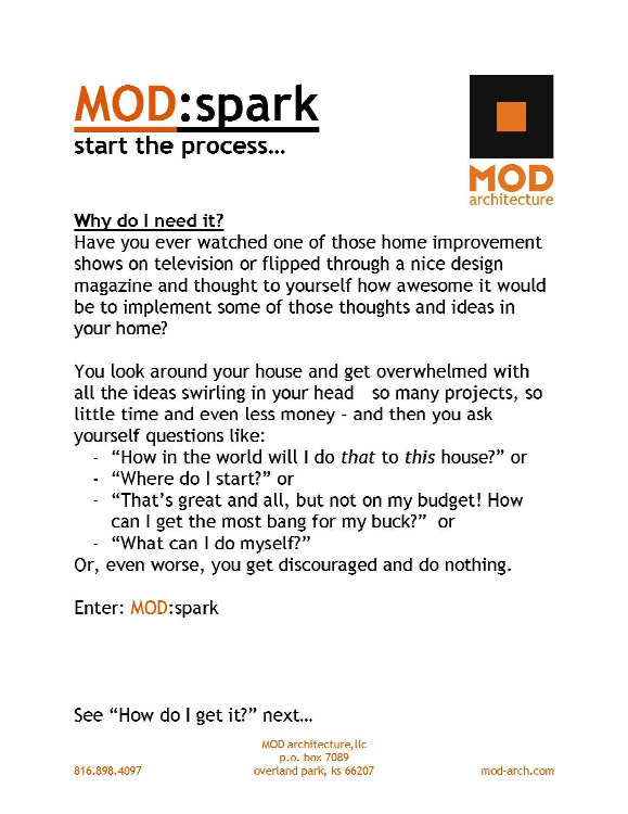A new concept of residential architectural consultation - affordable, personalized ideas for improving your home. "MOD:spark" was conceived by MOD Architecture as a way to introduce more people to the value of architectural services and ideas that could have direct, positive impact on their lives without the perceived barriers of cost or "project worthiness"...